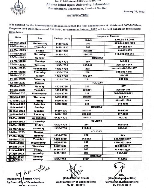 AIOU Date Sheet Autumn 2022